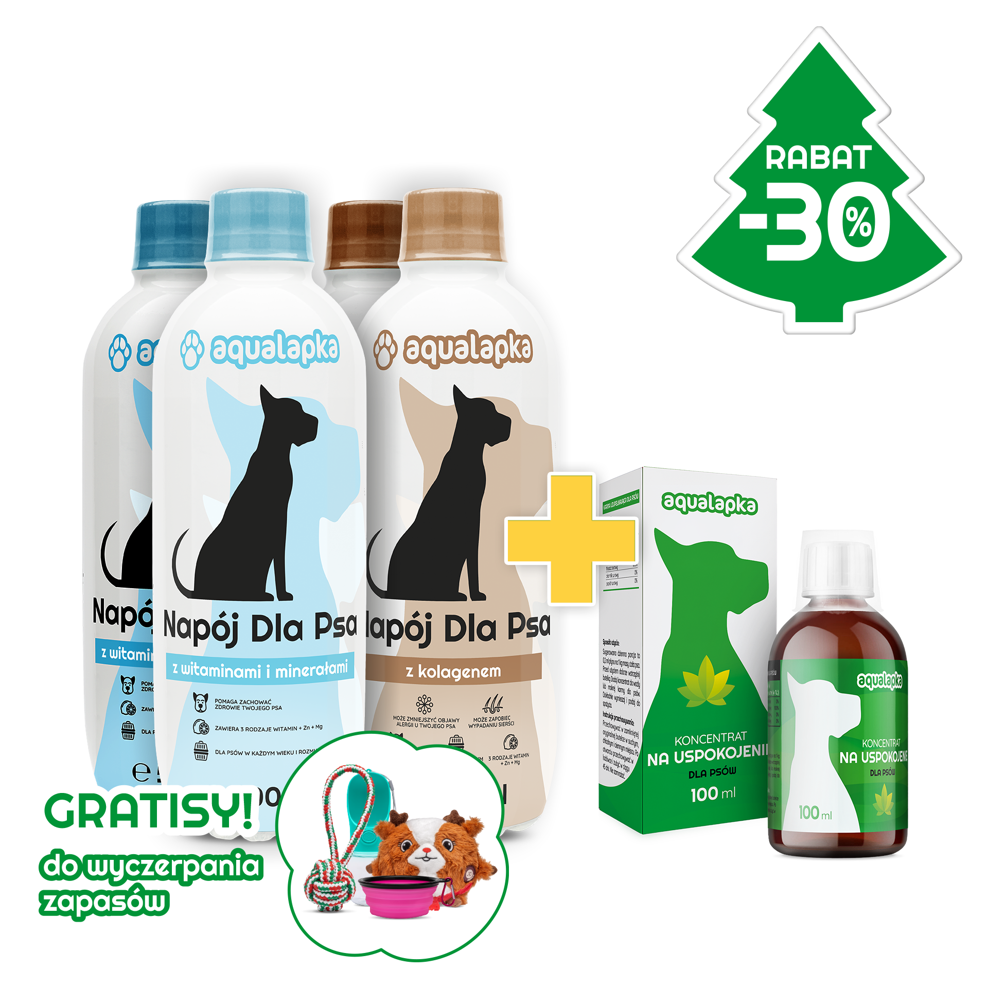 Czas na psie chillowanie! Ten zestaw to idealny wybór na stresujące dni – wizyty u weterynarza, burze czy podróże. Zawiera dwa napoje (z kolagenem i z witaminami) oraz koncentrat uspokajający. Wspiera odporność, stawy i dobre samopoczucie psa – wszystko w jednej misce, bez potrzeby podawania tabletek.