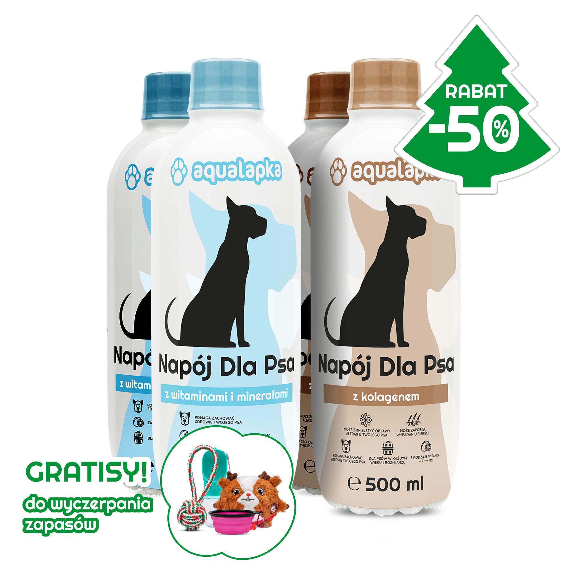 Dwa razy więcej zdrowia w jednej misce! Zestaw napojów Aqualapka to duet funkcjonalnych napojów dla psa: jeden z dodatkiem kolagenu wspierającego stawy i sierść, drugi z witaminami i minerałami wspomagającymi codzienną odporność i energię. Idealne do codziennego uzupełnienia wody – smacznie, zdrowo i bez stresu.